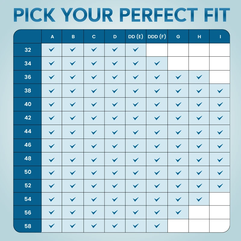 Cup sizes: A, B, C, D, DD (E), DDD (F), G, H, I